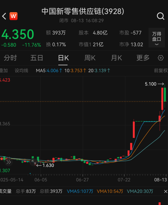 有趣的是,该公司的股价表现却十分活跃。在过去一年多的时间里,经历了多次大幅波动。2024年7月,原控股股东宏德控股向Alpine Treasure出售75%股权,涉及3.6亿股,现金价为1亿港元,相当于每股作价0.2778港元,收购价较停牌前折让约78.79%。复牌后,公司股价大涨,一度涨近4港元/股 。随后在四季度出现调整,2025年1月,S&T HLDGS正式更名为中国新零售供应链,又引发一波上涨,随后股价一度跌至1.6港元/股附近。而在本次收购停牌前,中国新零售供应链股价突然连续大涨,3个交易日上涨近75%,复牌之后的两个交易日,公司股价再度上涨近40%。