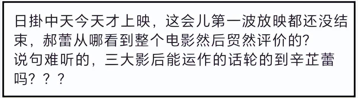 然而就在该片上映当天富灯网,网络却曝出郝蕾的朋友圈截图,她在文中不仅扫射各大电影节,还内涵了辛芷蕾威尼斯影后的含金量。不少网友纷纷质疑,刚上映郝蕾就下场内涵,难道是提前看过了?